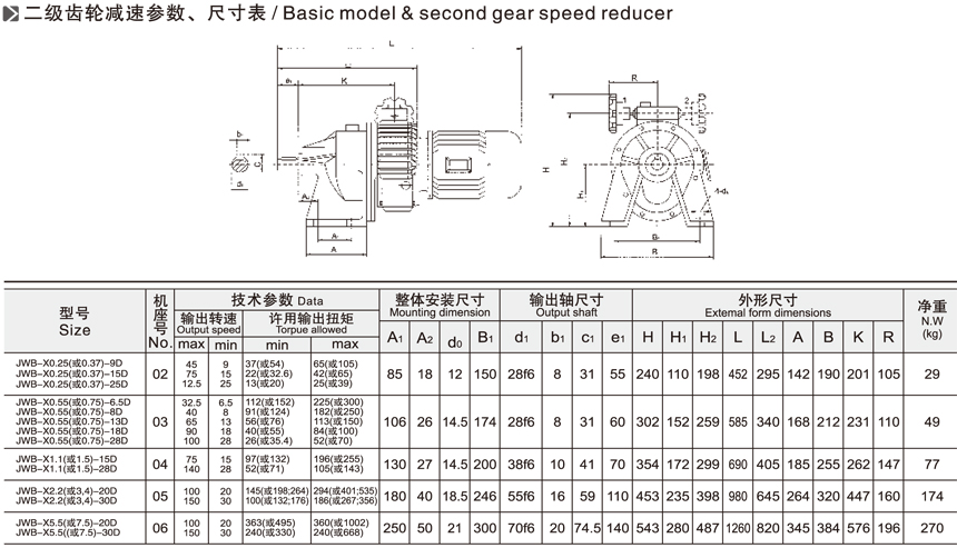 JWB-X系列無級變速機一級二級參數(shù)與尺寸表