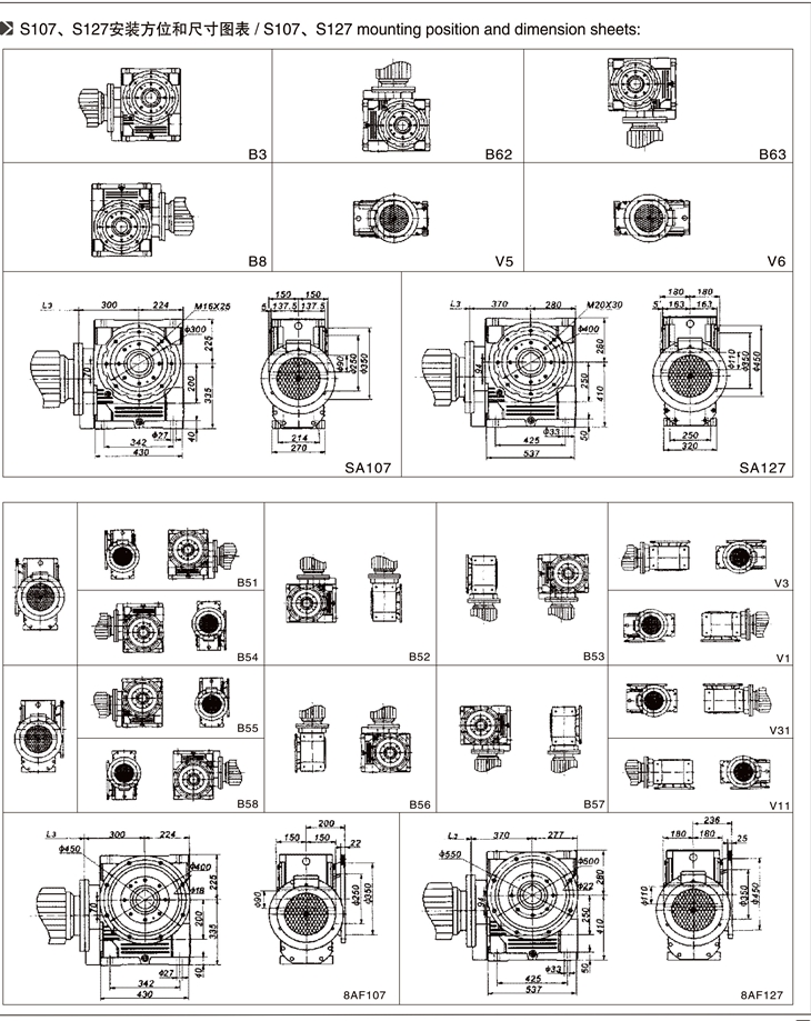 2、安裝方式:底腳安裝、空心軸安裝、法蘭安裝、扭力臂安裝、小法蘭安裝。